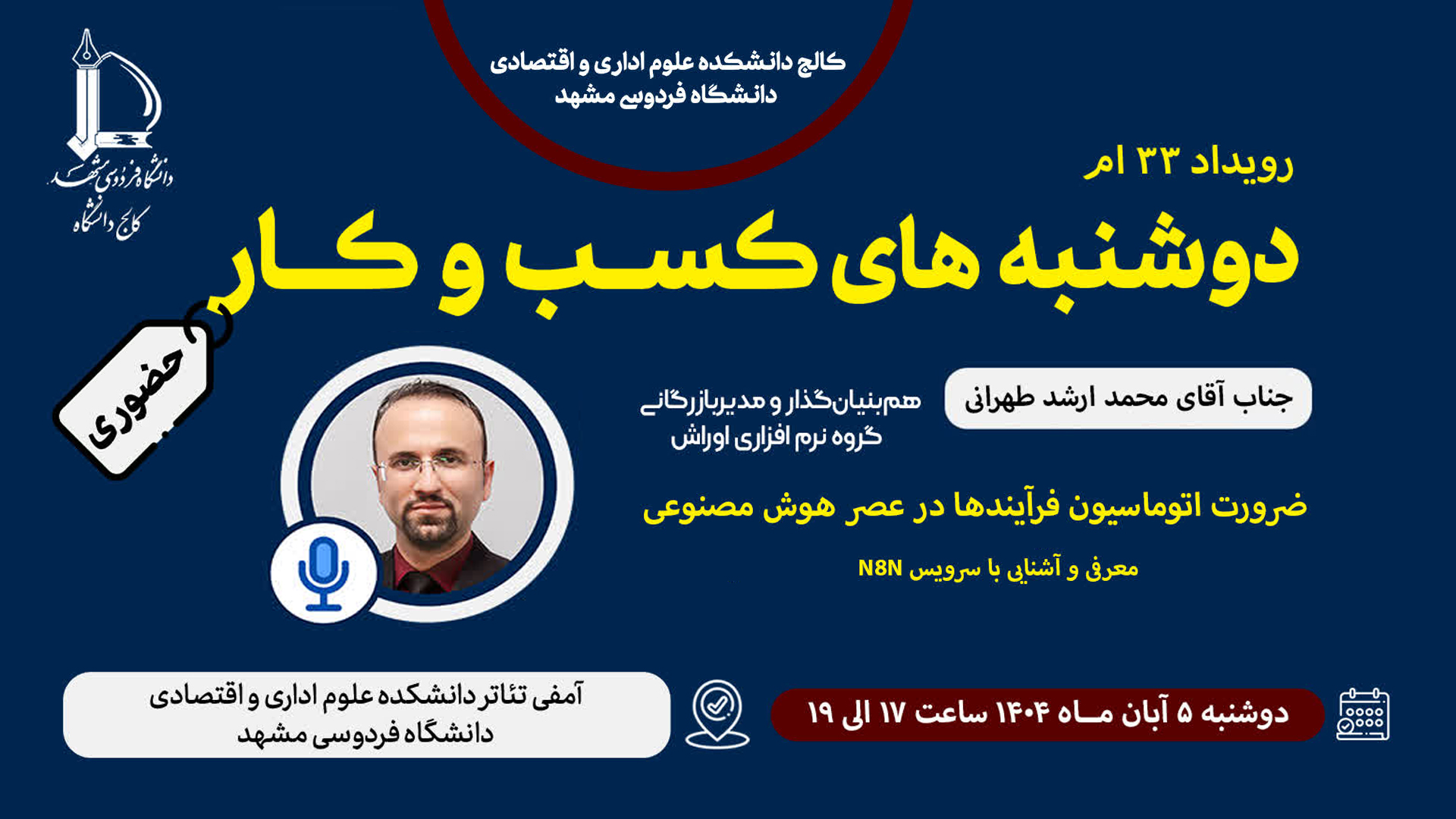 در دنیای پرشتاب امروز، اتوماسیون دیگر یک انتخاب نیست، بلکه ضرورتی است برای بقا و رشد سازمانها. سیوسومین رویداد از مجموعهی «دوشنبههای کسبوکار» کالج دانشکده علوم اداری و اقتصادی دانشگاه فردوسی مشهد، با موضوع «ضرورت اتوماسیون فرآیندها در عصر هوش مصنوعی» برگزار میشود.