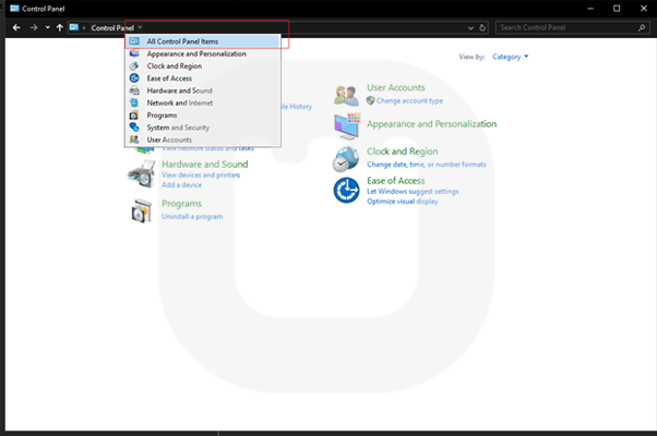 روی گزینه All Control Panel Items کلیک کنید.