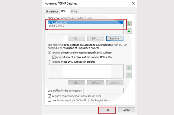در بخش DNS، روی Add کلیک کرده و IPهای زیر را اضافه کنید: